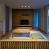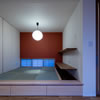 1階タタミの間の奥の紅色の壁はご主人肝いりの発案で、特に夜間の照明に映えノスタルジックな雰囲気を醸し出します。