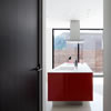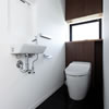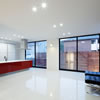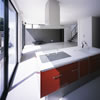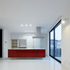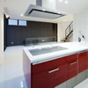 ご夫婦の希望で、1階の床には真っ白の600角セラミックタイルを敷き詰め、奥様こだわりの赤いシステムキッチンと相まって、若い感性を前面に醸し出しています。こだわりのご夫婦と共に細部に至るまで打合せを重ね、若い感性の明るく風の通り抜ける快適な住まいが完成しました。