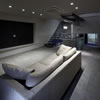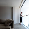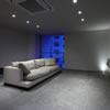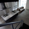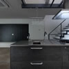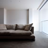セラミック系のタイルを張りつめた空間に、無機質なシステムキッチンと、大きなイタリア製のファブリックソファーが映えます!