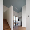 天井一杯のヒバ材で作られた重厚な玄関ドアを開けると、天窓からの柔らかな陽光が降り注ぐ室内へと導かれます。