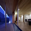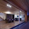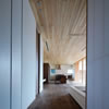 広めの廊下を進むと木製建具の引込戸にによる大開口を備えるリビングルームに入ります。天井一杯迄の特注の木製建具越しに
